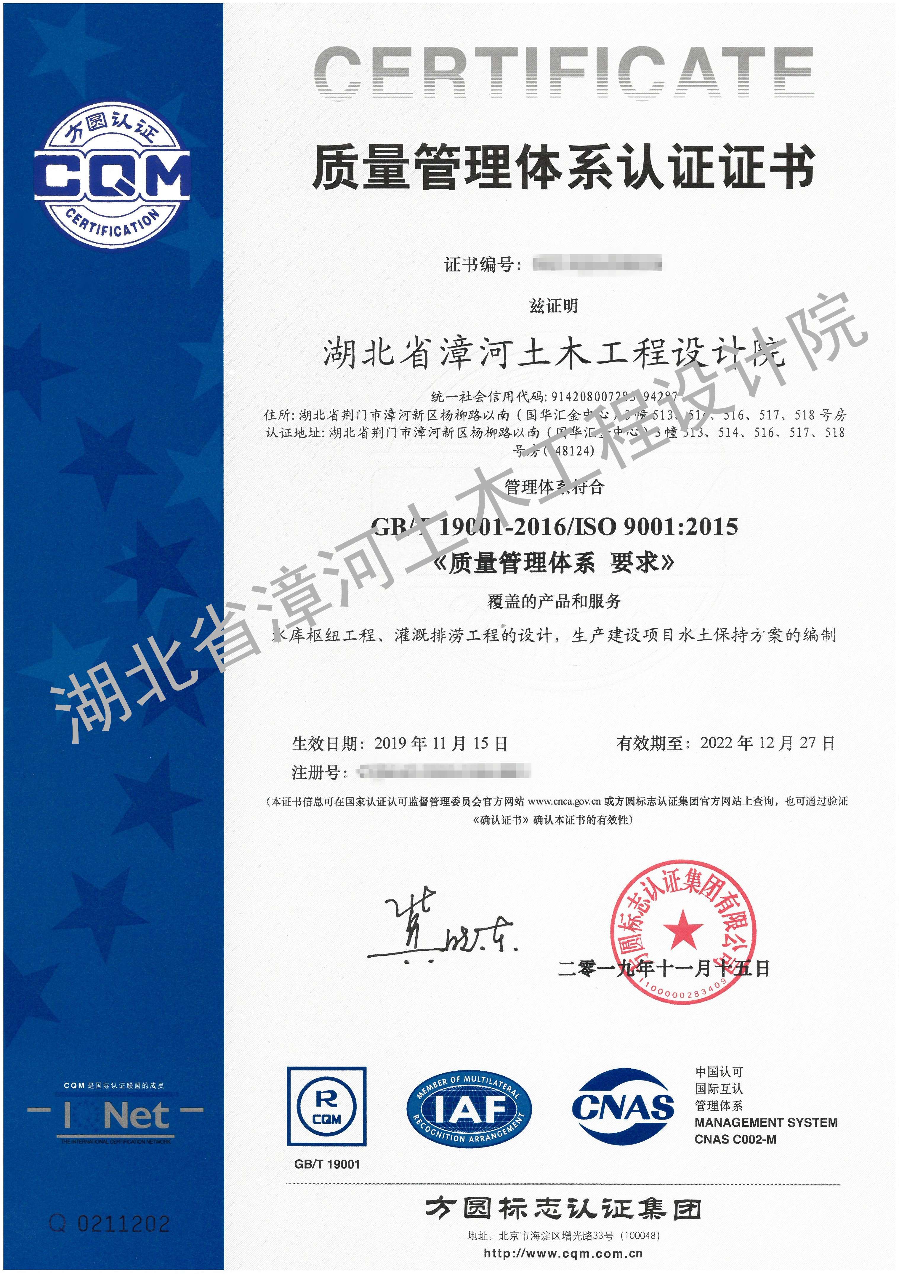 质量管理体系认证证书